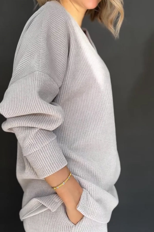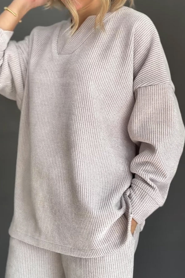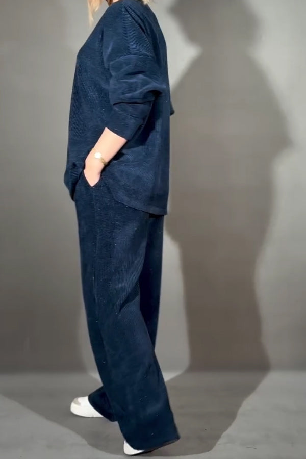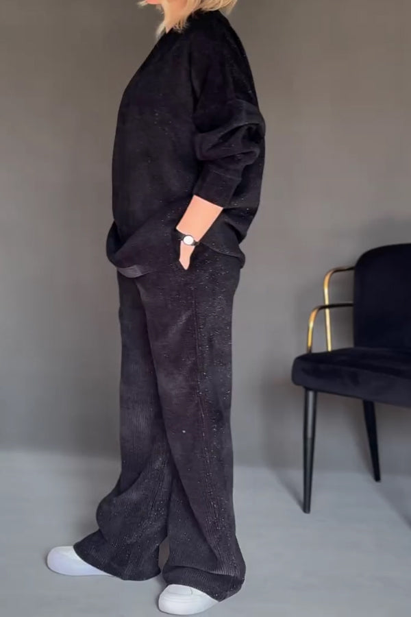 Women Casual Sparkling Corduroy Fur Collar V-Neck Top + Pants Suit