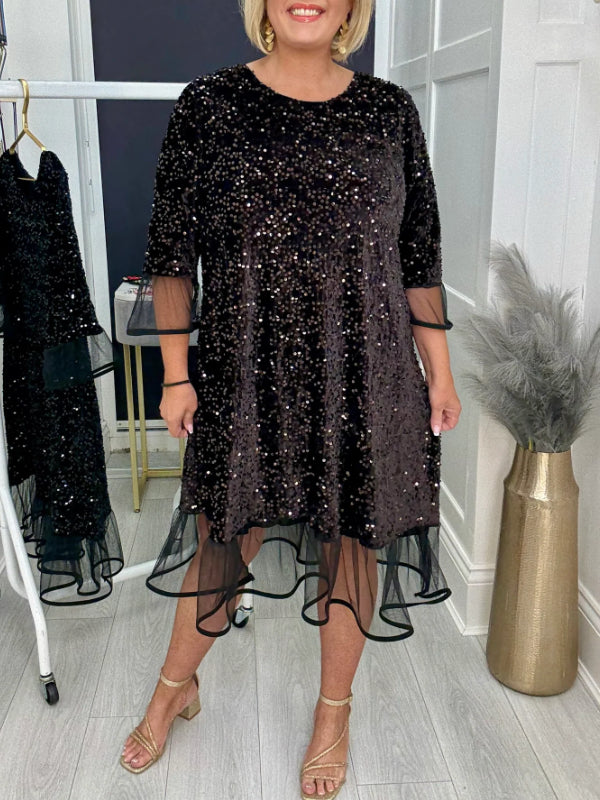 Women Round Neck Sequined Patchwork Casual Dress