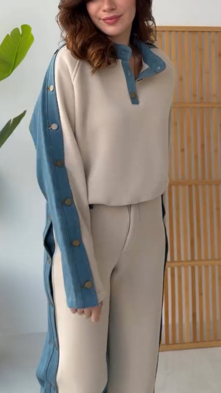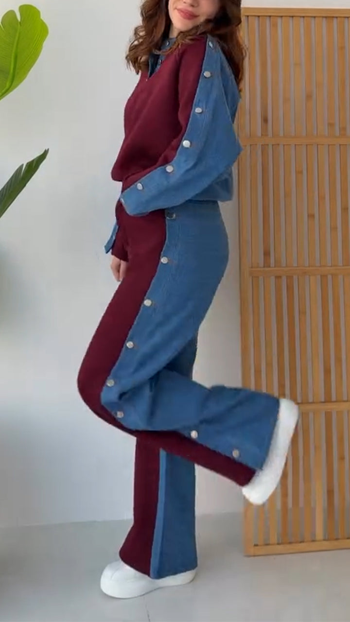 Women Round Neck Spliced Denim Casual Suit